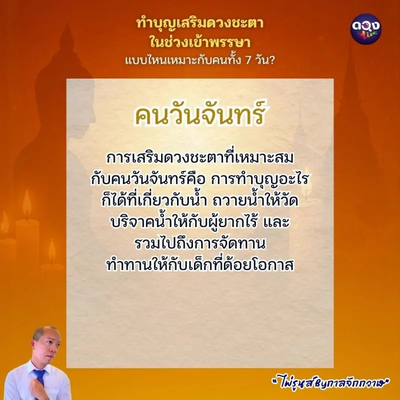 คนวันจันทร์ การเสริมดวงชะตาที่เหมาะสมกับคนวันจันทร์คือ การทำบุญอะไรก็ได้ที่เกี่ยวกับน้ำ ถวายน้ำให้วัด บริจาคน้ำให้กับผู้ยากไร้ และรวมไปถึงการจัดทาน ทำทานให้กับเด็กที่ด้อยโอกาส