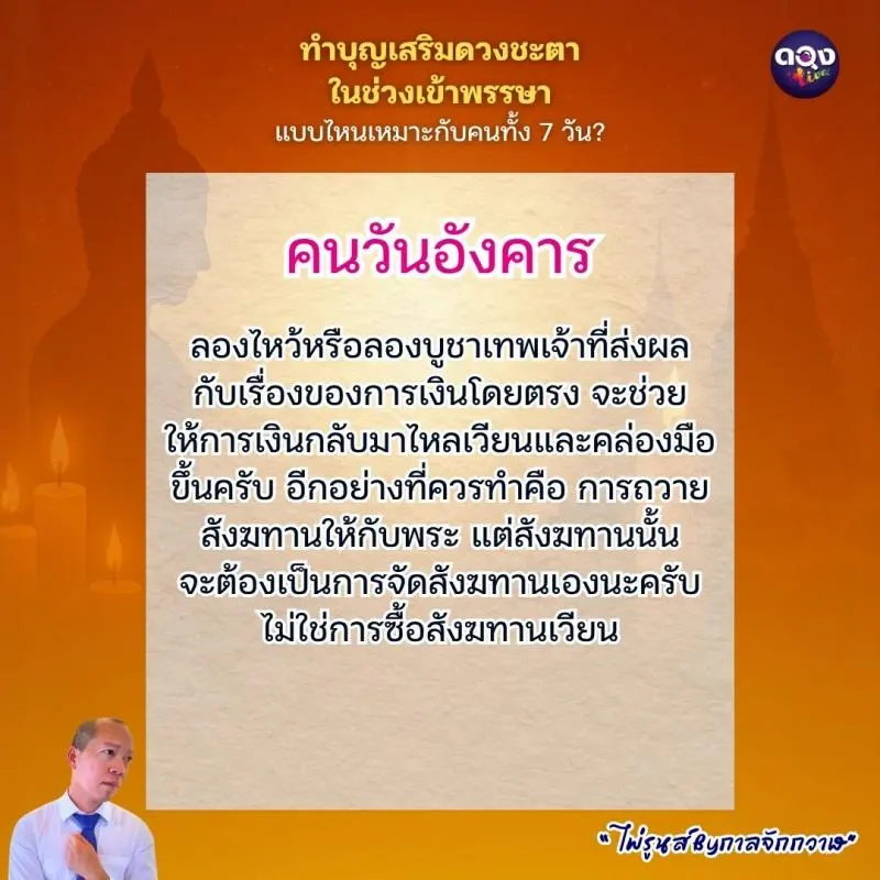 คนวันอังคาร ลองไหว้หรือลองบูชาเทพเจ้าที่ส่งผลกับเรื่องของการเงินโดยตรง จะช่วยให้การเงินกลับมาไหลเวียนและคล่องมือขึ้นครับ อีกอย่างที่ควรทำคือ การถวายสังฆทานให้กับพระ แต่สังฆทานนั้นจะต้องเป็นการจัดสังฆทานเองนะครับ ไม่ใช่การซื้อสังฆทานเวียน