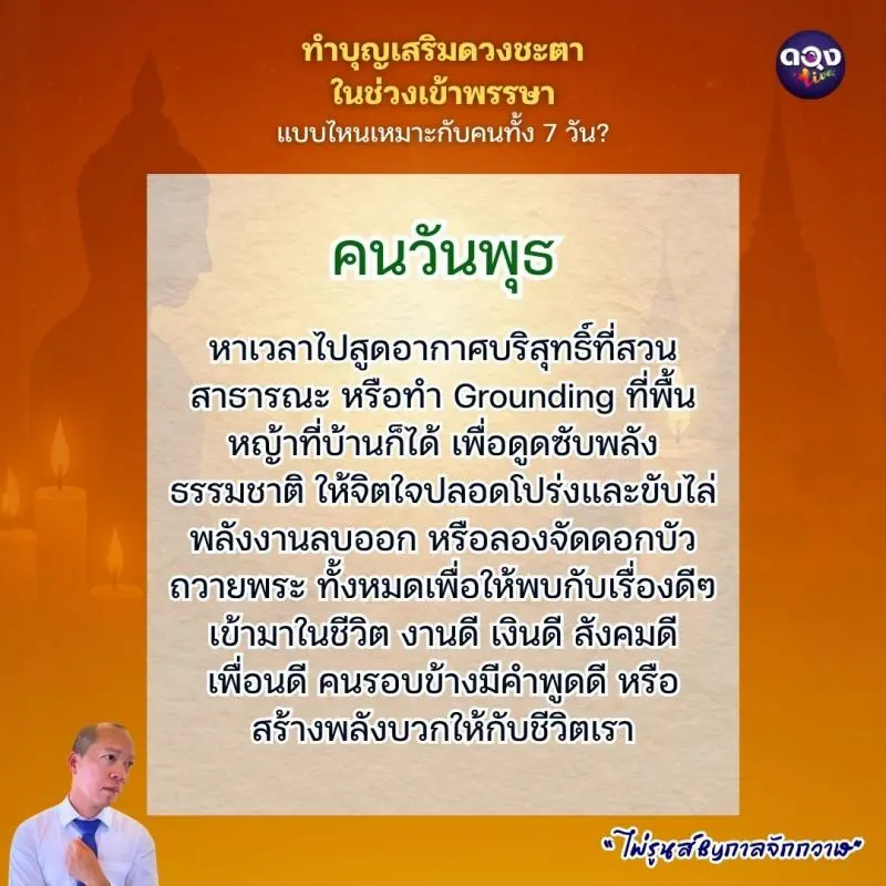 คนวันพุธ หาเวลาไปสูดอากาศบริสุทธิ์ที่สวนสาธารณะ หรือทำ Grounding ที่พื้นหญ้าที่บ้านก็ได้ เพื่อดูดซับพลังธรรมชาติ ให้จิตใจปลอดโปร่งและขับไล่พลังงานลบออก หรือลองจัดดอกบัวถวายพระ ทั้งหมดเพื่อให้พบกับเรื่องดีๆ เข้ามาในชีวิต งานดี เงินดี สังคมดี เพื่อนดี คนรอบข้างมีคำพูดดี หรือสร้างพลังบวกให้กับชีวิตเรา