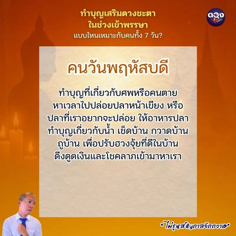 คนวันพฤหัสบดี ทำบุญที่เกี่ยวกับศพหรือคนตาย หาเวลาไปปล่อยปลาหน้าเขียง หรือปลาที่เราอยากจะปล่อย ให้อาหารปลา ทำบุญเกี่ยวกับน้ำ เช็ดบ้าน กวาดบ้าน ถูบ้าน เพื่อปรับฮวงจุ้ยที่ดีในบ้าน ดึงดูดเงินและโชคลาภเข้ามาหาเรา