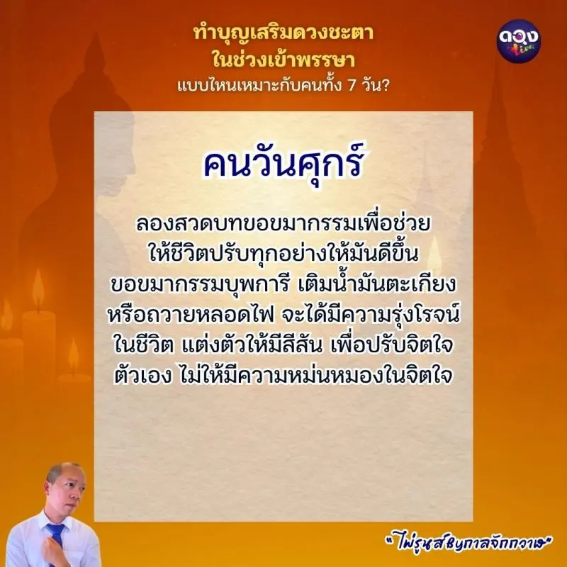 คนวันศุกร์ ลองสวดบทขอขมากรรมเพื่อช่วยให้ชีวิตปรับทุกอย่างให้มันดีขึ้น ขอขมากรรมบุพการี เติมน้ำมันตะเกียง หรือถวายหลอดไฟ จะได้มีความรุ่งโรจน์ในชีวิต แต่งตัวให้มีสีสัน เพื่อปรับจิตใจตัวเอง ไม่ให้มีความหม่นหมองในจิตใจ