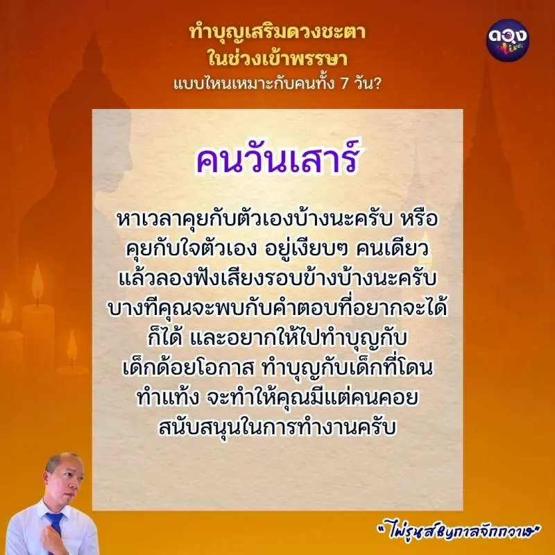 คนวันเสาร์ หาเวลาคุยกับตัวเองบ้างนะครับ หรือคุยกับใจตัวเอง อยู่เงียบๆ คนเดียว แล้วลองฟังเสียงรอบข้างบ้างนะครับ บางทีคุณจะพบกับคำตอบที่อยากจะได้ก็ได้ และอยากให้ไปทำบุญกับเด็กด้อยโอกาส ทำบุญกับเด็กที่โดนทำแท้ง จะทำให้คุณมีแต่คนคอยสนับสนุนในการทำงานครับ