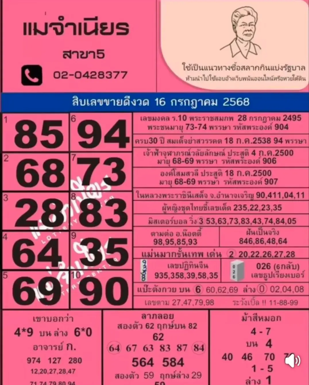 10 เลขขายดีแม่จำเนียร งวดวันที่ 16 กรกฎาคม 2568