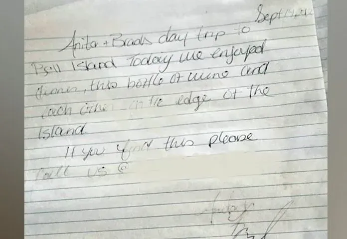 “วันนี้ Anita และ Brad มาเที่ยว Bell Island ทานอาหารเย็น ดื่มไวน์ขวดนี้ และใช้เวลาร่วมกันริมเกาะ หากคุณพบขวดนี้ โปรดโทรหาเรา”
