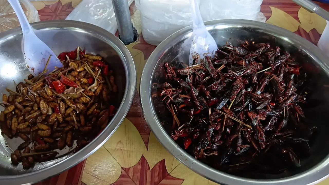 ตรงนี้มองครั้งแรกใช่เลยเหมือนบ้านเราคือตั๊กแตนและดักแด้ทอดทรงเครื่อง มีการใส่เครื่องทั้งหมดผสมคลุกเคล้าเข้าด้วยกัน อร่อยหากว่าเรานั้นชอบที่เผ็ดรสชาติดีก็ยังคงอร่อย