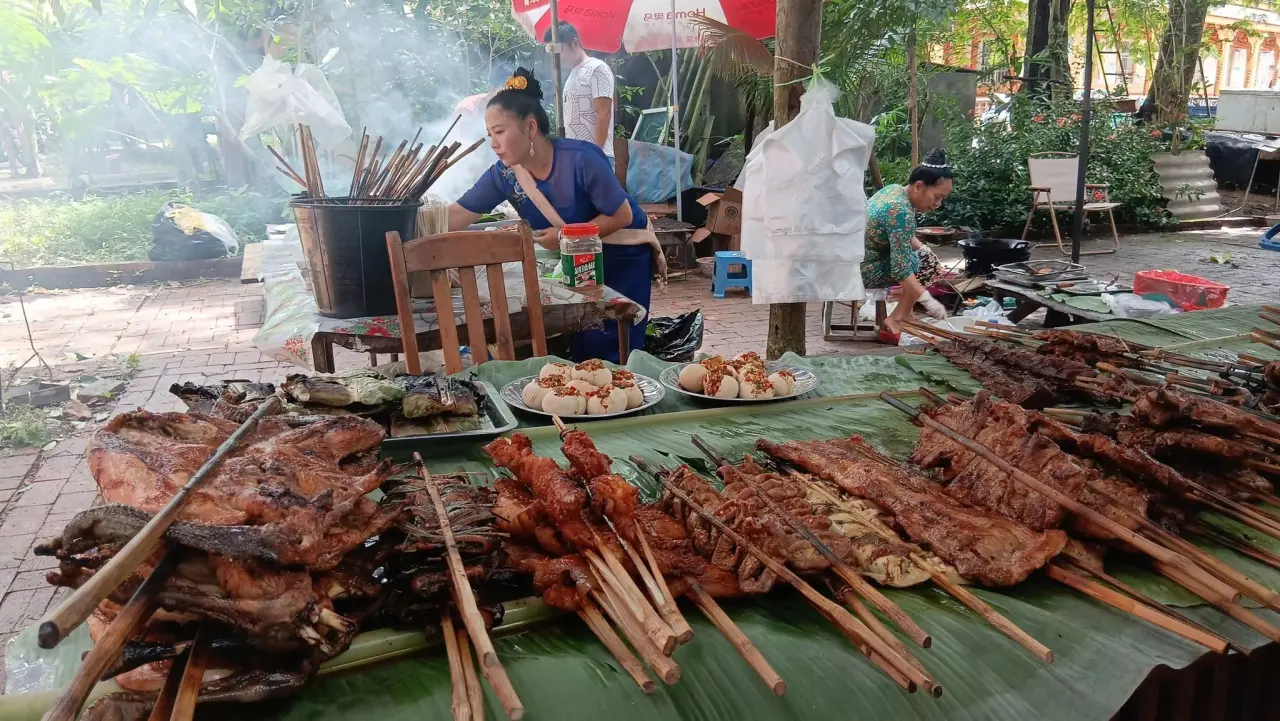 ตรงนี้คือเดินเข้าไปหาเลย อาหารที่อร่อยต้องลองดูเป็นพื้นบ้านมาก ไก่ย่าง ไส้ย่าง เหมือนไก่ย่างวิเชียรบ้านเรา ไก่ชิ้นตับอร่อยรสชาตินั้นไม่ค่อยแตกต่างกันเลย เพราะว่าไม่ว่าเรานั้นจะไปอยู่ไหนรสชาติและความอร่อยยังคงอยู่ ไม่หายไปไหน มันใช่เลย หิวมานานคิดถึงไก่ย่างต้องมาลองที่นี่เลย จะได้อร่อยไม่ลืมหากว่ามีส้มตำนี่เหมือนบ้านเราเลย