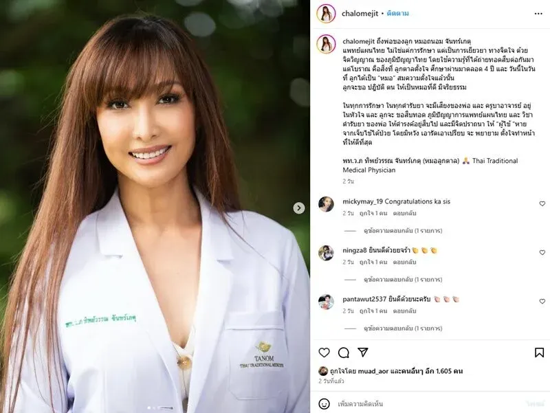 โดยเธอได้โพสต์ข้อความที่เต็มไปด้วยความตั้งใจ ความซาบซึ้ง และความเคารพในคุณพ่อของเธอ “หมอถนอม จันทร์เกตุ” ผู้เป็นแพทย์แผนไทยเช่นกัน ซึ่งถือเป็นแรงบันดาลใจสำคัญให้เธอเลือกศึกษาทางสายนี้อย่างมุ่งมั่นตลอดระยะเวลา 4 ปีที่ผ่านมา