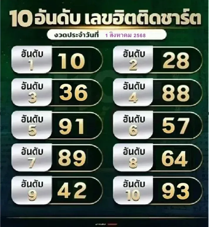 มาแล้ว! "10 อันดับ เลขฮิตติดชาร์ต" งวดวันที่ 1 สิงหาคม 68..เลขไหนเด็ด ส่องเลย!