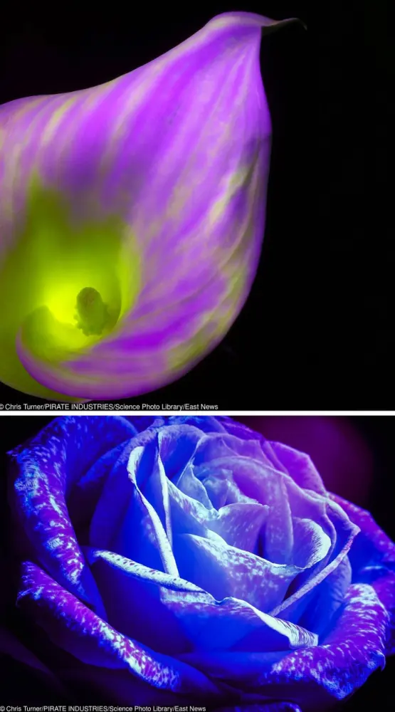 15. นี่เป็นรูปที่ถ่ายใต้แสงอัลตราไวโอเลตนี้ แสดงภาพดอกไม้แบบที่ผึ้งเห็น