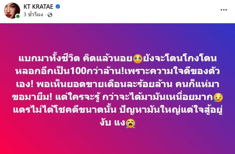 คุณกระแตได้กล่าวถึงความเหน็ดเหนื่อยจากการทำงานตลอดชีวิตว่า “แบกมาทั้งชีวิต คิดแล้วนอยด์ ยังจะโดนโกงโดนหลอกอีกเป็น 100 กว่าล้าน! เพราะความใจดีของตัวเอง!” พร้อมเปิดเผยว่าภายหลังจากที่เห็นผลประกอบการของตนเติบโตอย่างต่อเนื่อง มียอดขายเดือนละกว่าร้อยล้านบาท ก็มีผู้คนมากมายเข้ามาขอความช่วยเหลือหรือยืมเงิน ซึ่งเป็นสาเหตุหนึ่งที่นำไปสู่ความเสียหายทางการเงินดังกล่าว