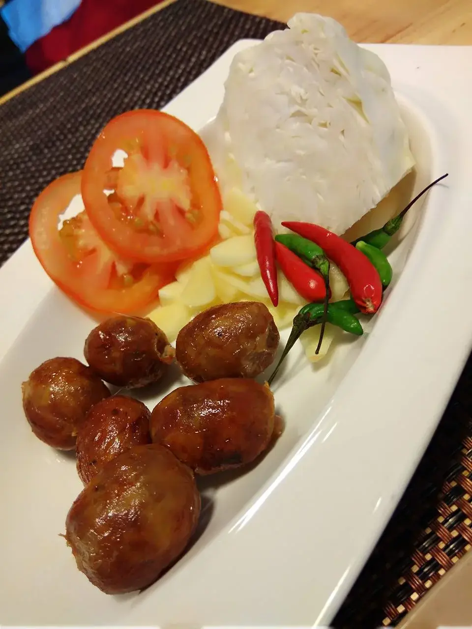 เมนูที่สองที่สั่งคือไส้กรอกอีสาน ที่หากว่าเรานั้นซื้อในรถที่เขาขับขายที่ไทยนั้นคือก้อนละหนึ่งบาท แต่พอมาถึงที่นี่นั้นกลายเป็นหกเม็ดนั้นหกสิบบาท ขายแบบนี้รวยแน่นอนเลย ได้กำไรแต่ว่าไม่เป็นไรอร่อยเพราะว่ามีพริก กระเทียม ผักเคียงให้เรานั้นทานด้วย อร่อยคนเดียวเพราะว่าเรานั้นเดินมากินคนเดียวไม่มีเพื่อนส่วนข้าวเหนียวนั้นก็เพียงกระติบเดียวเท่านั้น