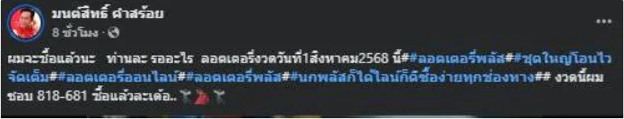 สำหรับเลขเด็ดที่หลายคนรอคอย หวยในงวดนี้ก็จะออกในวันศุกร์ที่ 1 สิงหาคม 2568 ทางนักร้องลูกทุ่งชื่อดังขวัญใจมหาชนคนเดิมอย่าง ‘มนต์สิทธิ์ คำสร้อย’ ก็ไม่ทำให้หลายคนต้องรอเก้อ เพราะล่าสุด เจ้าตัวก็ได้ออกมาแชร์แนวทางเลขเด็ดให้แฟนๆ ได้ลุ้นรวยกันอีกแล้ว และโพสต์ข้อความผ่านเทางฟซบุ๊กส่วนตัว มนต์สิทธิ์ คำสร้อย เผยถึงเลขเด็ดที่ชอบสำหรับหวยงวดวันที่ 1 สิงหาคม 68 นี้ ระบุข้อความเอาไว้ว่า "ผมจะซื้อแล้วนะ ท่านละ รออะไร ลอตเตอรี่งวดวันที่ 1 สิงหาคม 2568 นี้ งวดนี้ผมชอบ 818 - 681 ซื้อแล้วละเด้อ.."