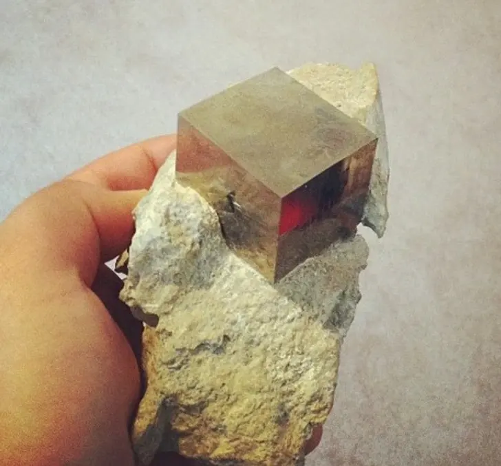 11. นี่เป็นหินไพไรต์ที่สมบูรณ์แบบ ที่อยู่ในรูปแบบหินที่มีแร่เป็นก้อน ๆ ฝังอยู่ตามธรรมชาติ