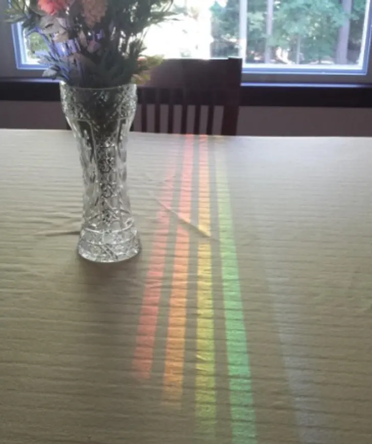 14. แถบสเปกตรัมนี้สะท้อนออกมาจากหน้าต่างห้องอาหารผ่านเก้าอี้อย่างไร้ที่ติ