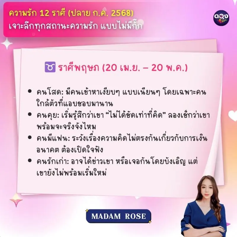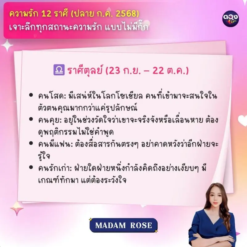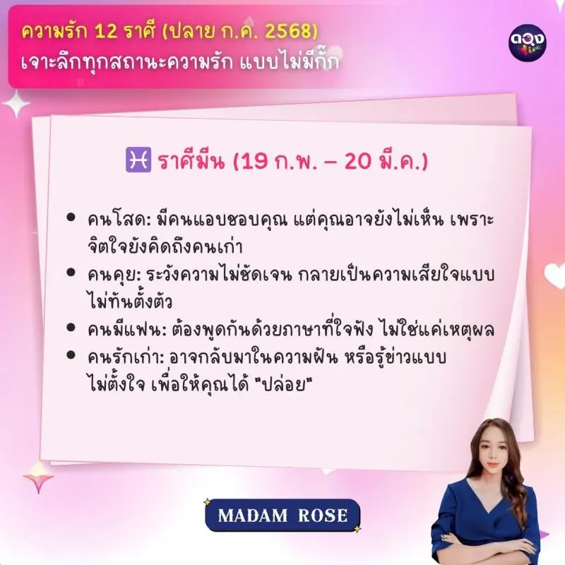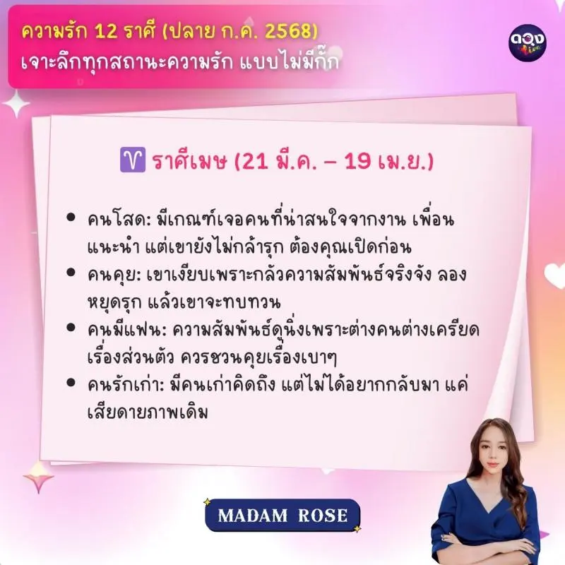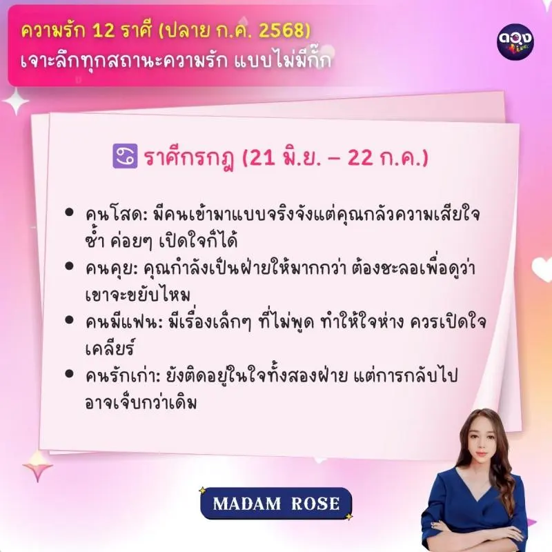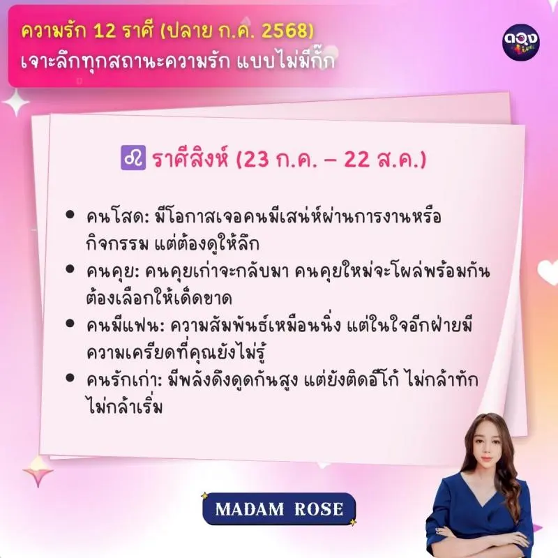 ความรัก 12 ราศี (ปลาย ก.ค. 2568) เจาะลึกทุกสถานะความรัก แบบไม่มีกั๊ก by MADAM ROSE