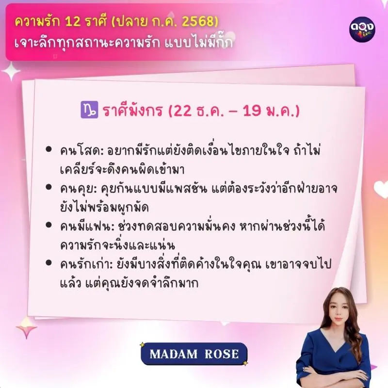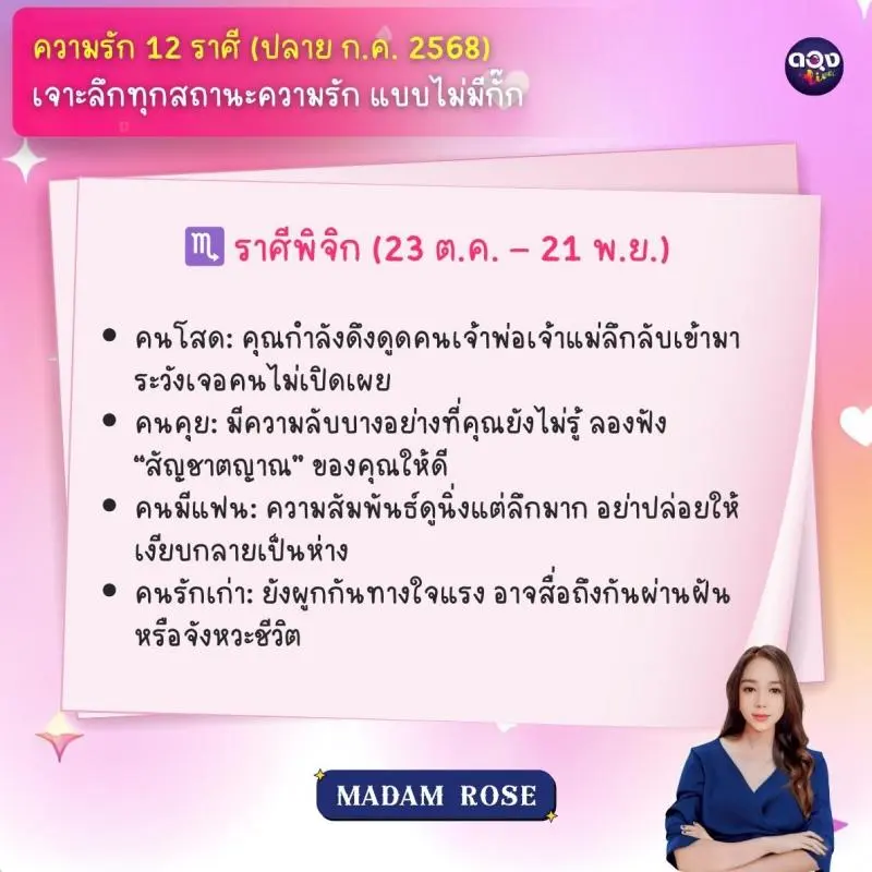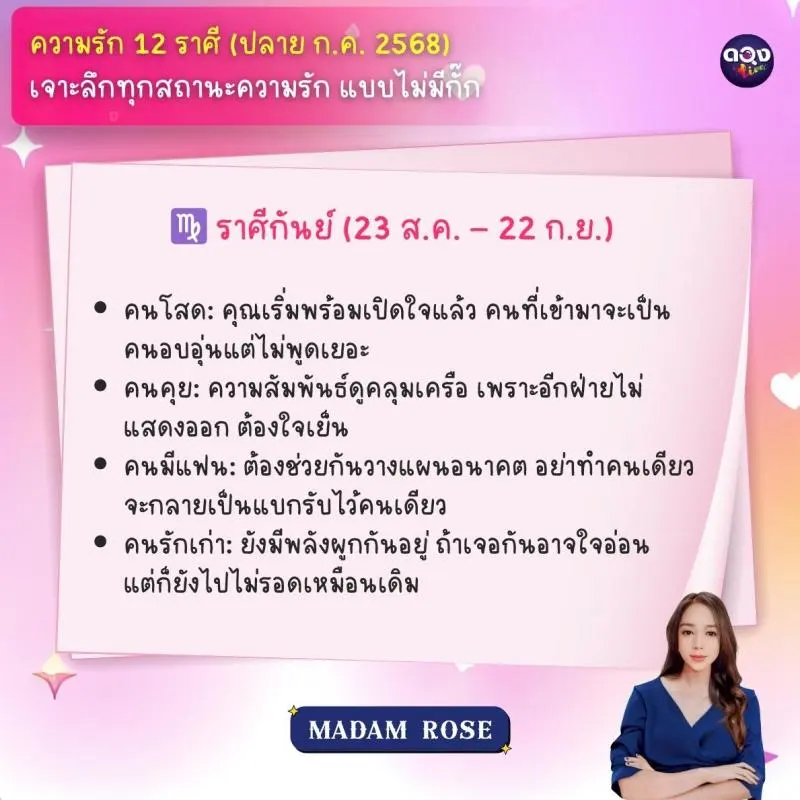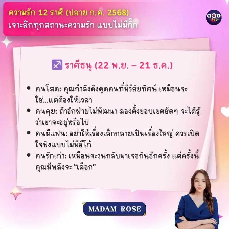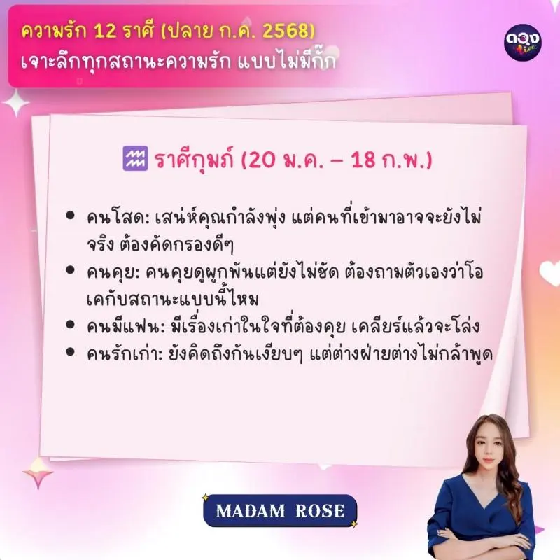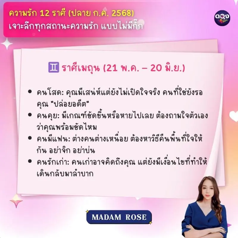 ความรัก 12 ราศี (ปลาย ก.ค. 2568) เจาะลึกทุกสถานะความรัก แบบไม่มีกั๊ก by MADAM ROSE