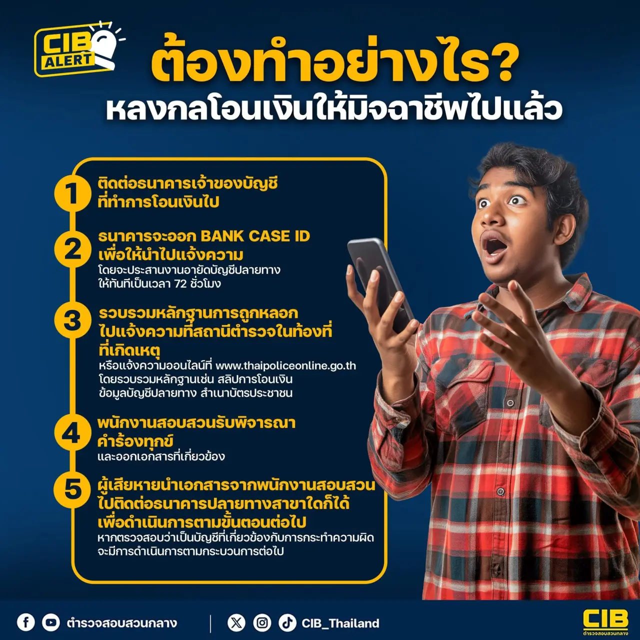 📍ตำรวจสอบสวนกลาง (CIB) จึงขอแนะนำ 5 ขั้นตอนวิธีการดำเนินการหลังจากรู้ตัวว่าโอนเงินให้มิจฉาชีพแล้ว ซึ่งประชาชนสามารถทำตามขั้นตอนได้ดังนี้