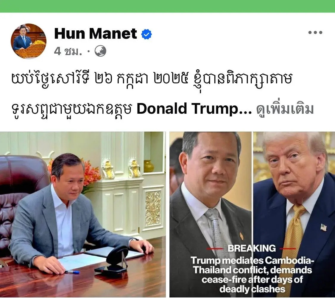 สวัสดีครับเพื่อนๆ เมื่อคืนผมกำลังจะเข้านอน เปิดมือถือเล่นเพลินๆ ก่อนหลับตาอยู่ดีๆ ก็เจอข่าวๆ หนึ่งที่ทำเอาผมต้องตาโต ตาค้างไปเลยครับ! คือมันไม่ใช่ข่าวธรรมดา แต่เป็นโพสต์จาก ฮุน มาเน็ต นายกรัฐมนตรีกัมพูชา ที่ออกมาโพสต์กลางดึก ประมาณตีหนึ่งตีสอง ว่ามีการ คุยโทรศัพท์กับ “โดนัลด์ ทรัมป์” อดีตประธานาธิบดีสหรัฐอเมริกา!!