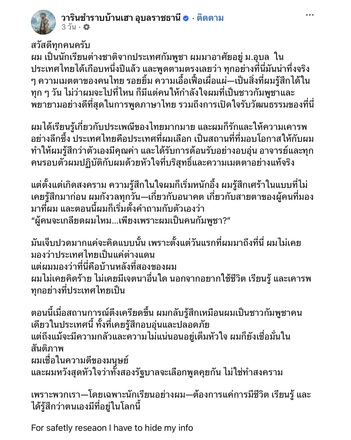 หนุ่มนศ.กัมพูชา ในไทยโพสต์ถาม “ผู้คนจะเกลียดผมไหม…เพียงเพราะผมเป็นคนกัมพูชา?”