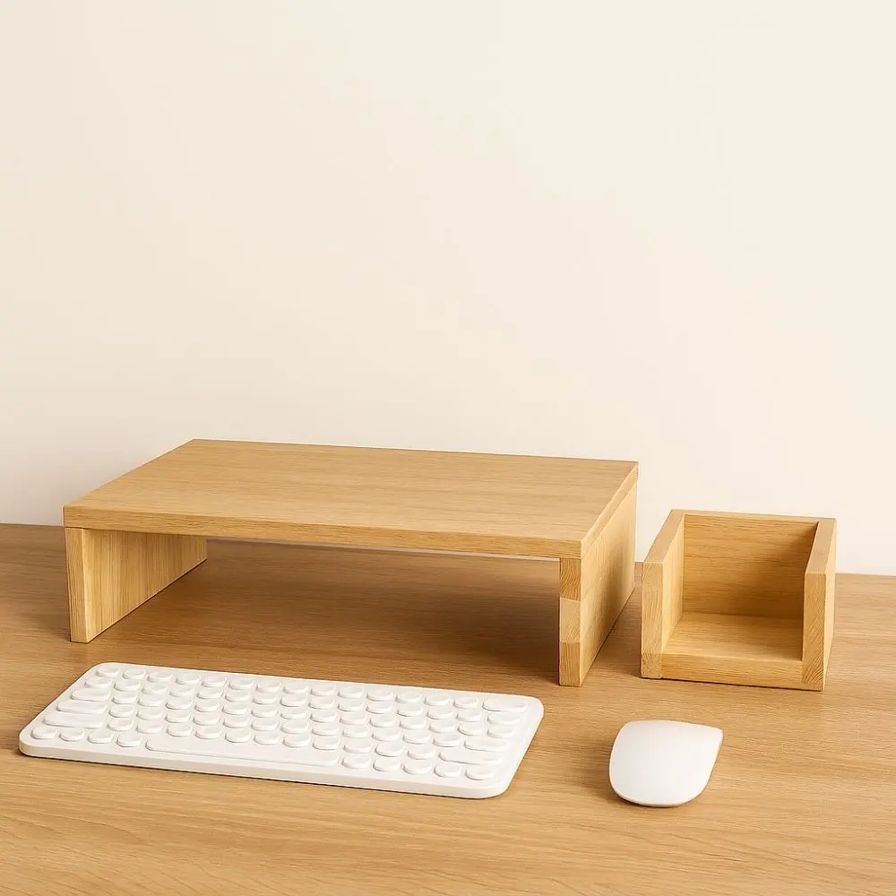 - ประโยชน์: ยกจอและคีย์บอร์ดให้ระดับสายตา ช่วยลดอาการปวดคอ เพิ่มพื้นที่เก็บใต้ฐาน และโชว์ลายไม้สวยของ ไม้ประสาน