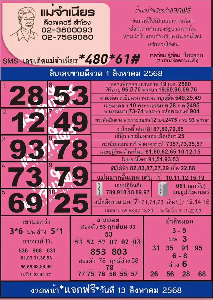 10 อันดับเลขขายดี หวยแม่จำเนียร 1/8/68