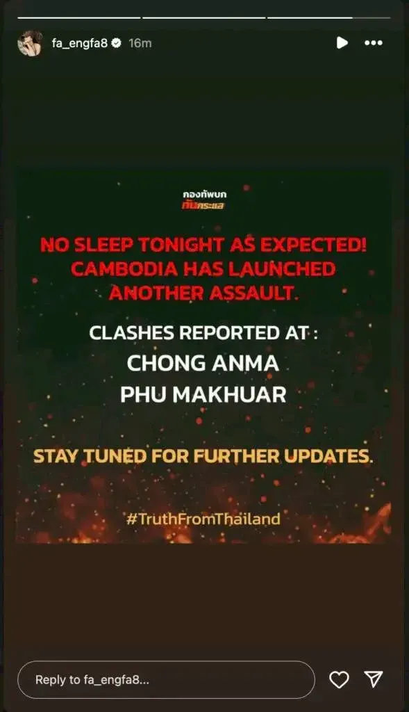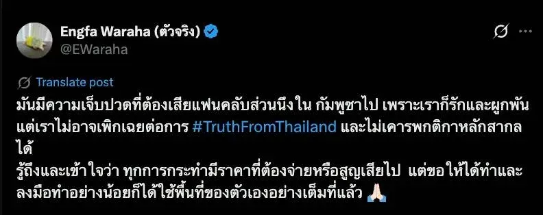 อิงฟ้า วราหะ ยืนหยัดกลางพรมแดนความจริง: โพสต์ #TruthFromThailand สะเทือนโซเชียลท่ามกลางวิกฤตชายแดนไทย-กัมพูชา