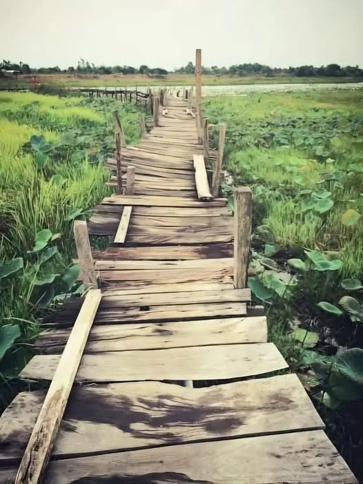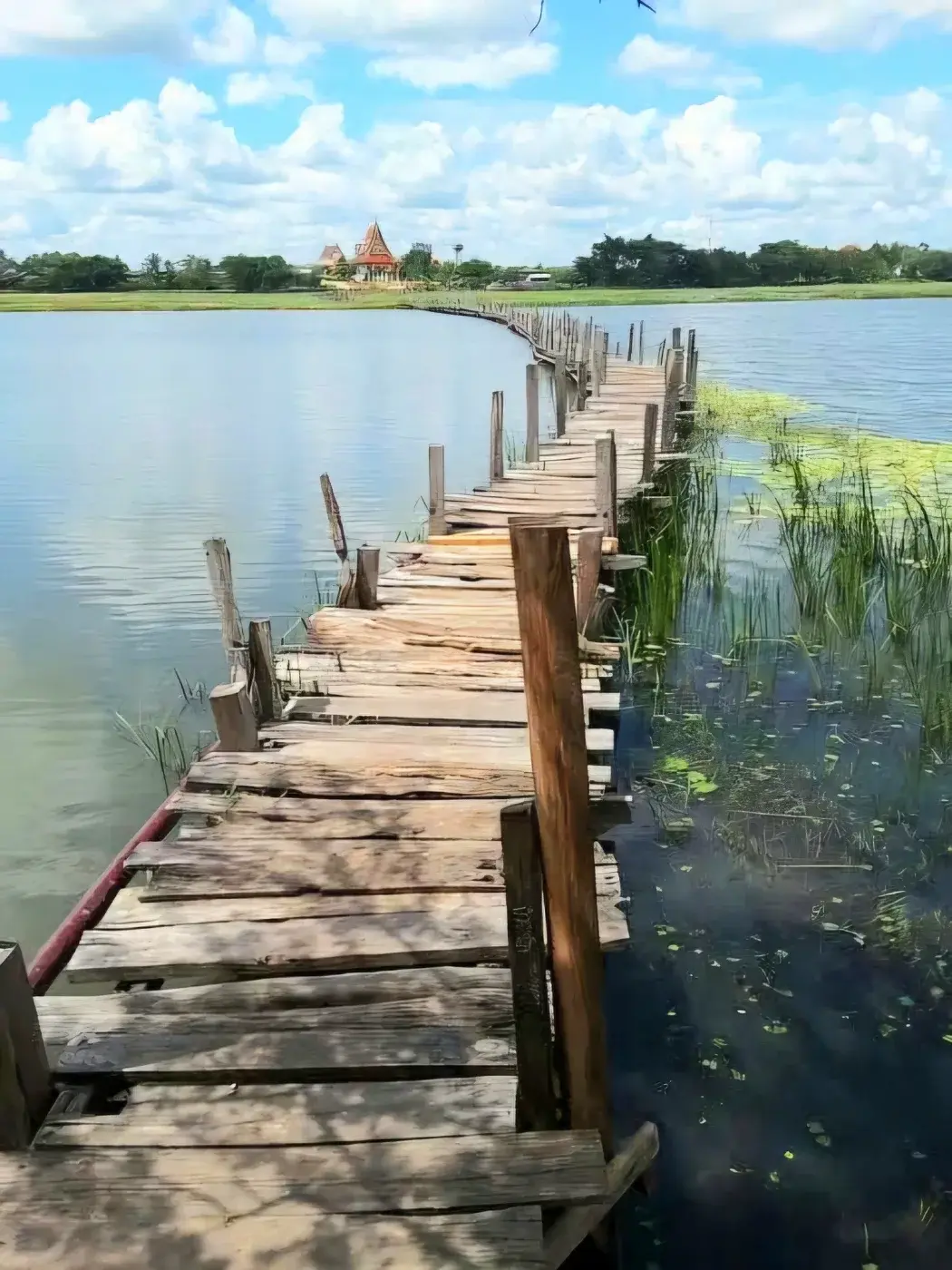 ตัวสะพานสร้างจากไม้ทั้งหมด สะท้อนภูมิปัญญาและวิถีชีวิตดั้งเดิมของชาวบ้านในพื้นที่ เส้นทางของสะพานไม่ได้ตรงเรียบ แต่โค้งเว้าไปตามแนวหนองน้ำ สร้างมุมมองที่หลากหลายและทำให้การเดินชมเต็มไปด้วยความเพลิดเพลิน สองข้างสะพานเป็นผืนน้ำที่มีบัวและพืชน้ำเขียวขจีโอบล้อม ส่วนรอบนอกเป็นทุ่งนาและต้นไม้ใหญ่ ให้บรรยากาศเงียบสงบ เหมาะแก่การมาสูดอากาศบริสุทธิ์และปล่อยใจให้พักผ่อน