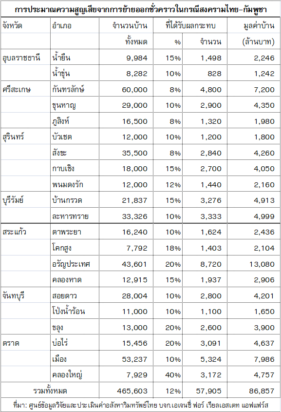 2. อย่างไรก็ตามแต่ละอำเภออาจได้รับผลกระทบมากน้อยแตกต่างกันตามตามทำเลที่ตั้งที่อยู่ห่างมากหรือน้อยจากชายแดน จึงประมาณการเปอร์เซ็นต์ของผลกระทบที่แตกต่างกัน บางอำเภอที่อยู่ติดชายแดนมากเป็นพิเศษ เช่น อำเภอคลองใหญ่ จังหวัดตราด อาจได้รับผลกระทบถึงประมาณ 40% ในขณะที่อำเภอกันฑรลักษ์ และอำเภอภูสิงห์ ของจังหวัดศรีสะเกษ และอำเภอสังขะ จังหวัดสุรินทร์ คาดว่าอาจได้รับผลกระทบเพียง 8% ของบ้านทั้งหมด