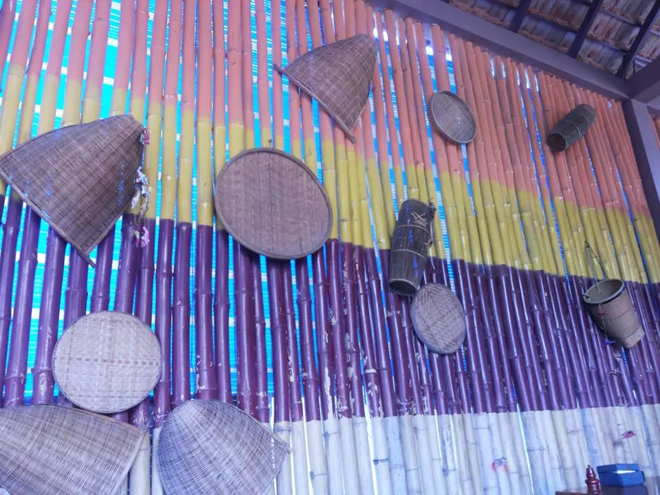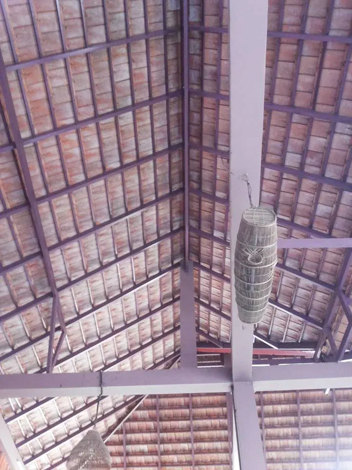 หลังคาของร้านอาหารที่นี่ ทำจากใบจากหรือเรานั้นเรียกกันง่ายๆ ว่าหญ้าคาบ้านเรา แต่พอมาดูจริงๆ นั้นเหมือนกันกับกระเบื้องที่ทำลวดลายให้เหมือน แต่ไม่ได้ถามคนที่นี่ว่ามันคืออะไร ชอบที่จะมองดูรอบๆ ที่เขานั้นตกแต่ง สิ่งเหล่านี้นั้นจะหายไปจากสังคมของเราเพราะว่าในการจับปลานั้นเริ่มที่จะมีในส่วนของการใช้ไฟฟ้าซอตซึ่งมันทำให้ปลานั้นหายไปและหากว่าไม่โดนจับไปประกอบอาหารก็จะกลายเป็นหมันไม่สามารถที่จะขยายพันธุ์ได้ ทำให้หายไปจากระบบนิเวศน์จึงต้องได้มีการเลี่ยงกันในกระซังบ้าง เลี้ยงในสระ