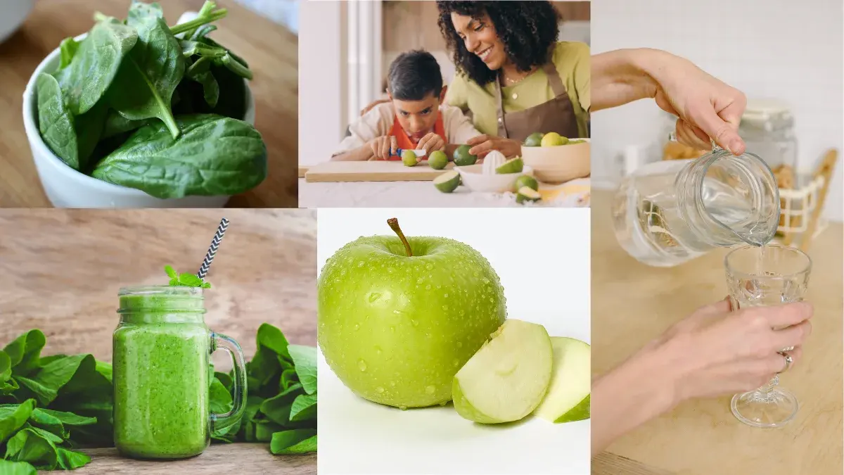 ผักโขม 1 ถ้วย ผักคะน้า ½ ถ้วย แอปเปิ้ลเขียว 1 ลูก มะนาว 1 ช้อนโต๊ะ น้ำเปล่า 1 แก้ว ปั่นผักและผลไม้ทั้งหมดให้เข้ากันจากนั้นนำมากรองกากออกก่อนที่จะดื่ม