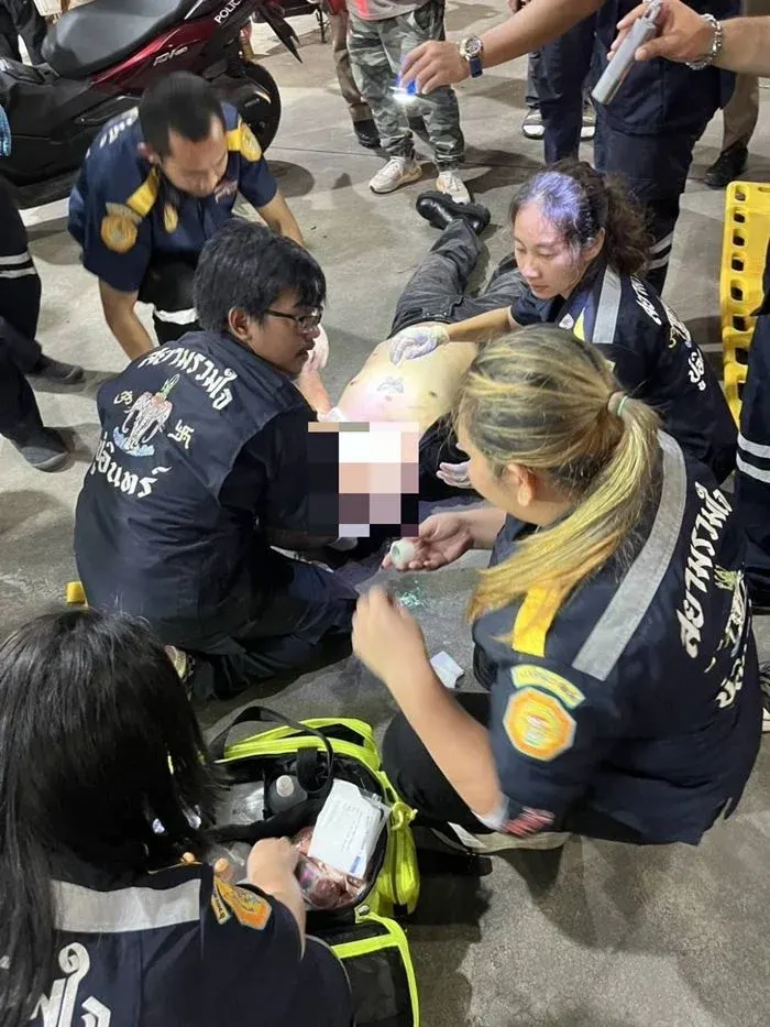 เจ้าหน้าที่อาสาสมัครกู้ภัยเร่งเข้าช่วยเหลือ พร้อมนำตัวส่งโรงพยาบาลอย่างเร่งด่วน ท่ามกลางความตกตะลึงของผู้พบเห็นในที่เกิดเหตุ
