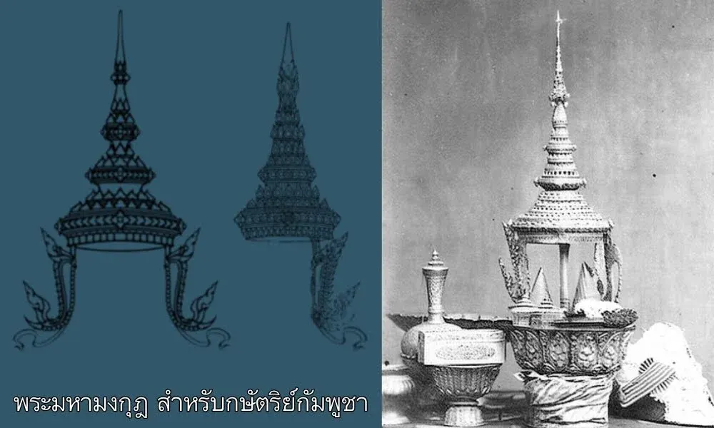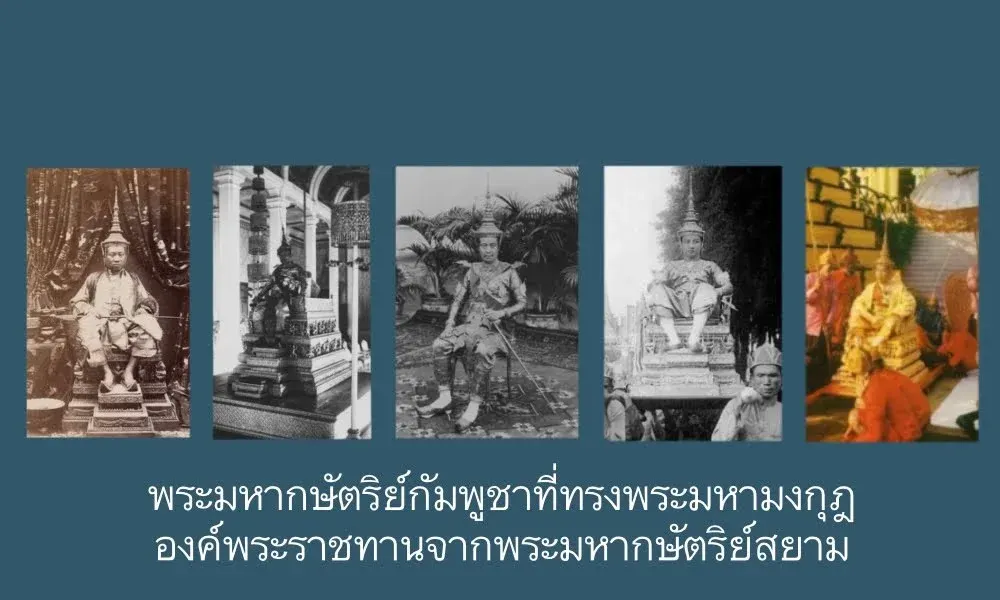 ภาพพระมหากษัตริย์กัมพูชาที่ทรงพระมหามงกุฎที่ได้รับพระราชทานจากสยาม เรียงจากซ้ายไปขวาตามลำดับการครองราชสมบัติ 1.พระบาทสมเด็จพระนโรดม บรมรามเทวาวตาร , 2.พระบาทสมเด็จพระสีสุวัตถิ์, 3.พระบาทสมเด็จพระสีสุวัตถิ์ มุนีวงศ์, 4.พระบาทสมเด็จพระนโรดม สีหนุ, 5.พระบาทสมเด็จพระนโรดม สุรามฤต