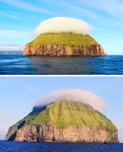 อีกหนึ่งเอกลักษณ์ที่ทำให้ Lítla Dímun เป็นที่จดจำ คือเกาะมักถูกปกคลุมด้วยเมฆแปลกตาอยู่เสมอ เมฆเหล่านี้ส่วนใหญ่จะเป็น Lenticular cloud หรือที่หลายคนรู้จักกันว่า “เมฆจานบิน” เกิดขึ้นเมื่อกระแสลมชื้นพัดผ่านภูเขาสูง ทำให้อากาศยกตัวและก่อตัวเป็นชั้น ๆ ของคลื่นเมฆที่มีความชื้นไม่เท่ากัน จนกลายเป็นเมฆรูปทรงประหลาดลอยอยู่เหนือยอดเกาะราวกับเกาะนี้ถูกซ่อนอยู่ใต้หมวกเมฆธรรมชาติ