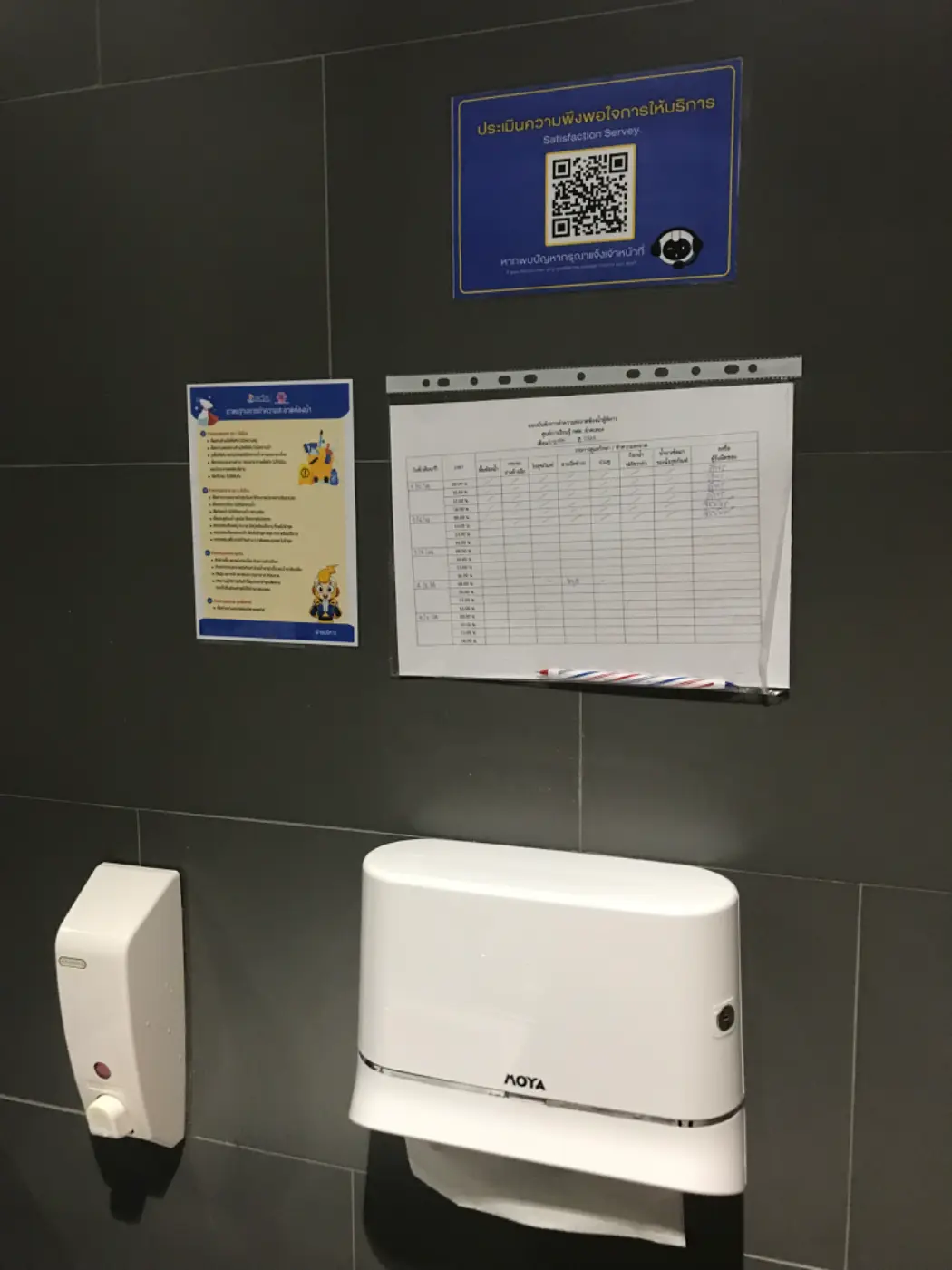 มาตรงนี้หลังจากทำธุระเสร็จแล้ว เดินมาเพื่อที่จะล้างมือ มีสบู่ล้างมือพร้อมกระดาษในการเช็ดชำระ ถัดจากการหยิบทิชชูเช็ดมือให้แห้งนั้นจะมี โค๊ดสำหรับประเมินความพึวพอใจในการใช้งาน ว่าเรานั้นจะให้เท่าไหร่ความสะอาด แสดงว่าในการเข้าห้องน้ำจะต้องนำโทรศัพท์มือถือเข้าไปด้วย แต่ครั้งนี้ไม่ได้นำเข้าไป้ลยไม่ได้ทำและต้องใช้เวลานานกว่าจะเชื่อมอินเทอร์เน็ตแล้วเพื่อนด้านนอกคือ รอเข้าห้องน้ำกัน