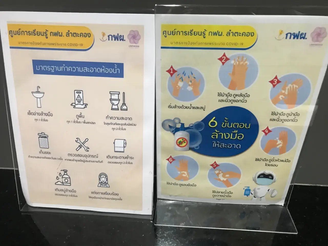 ยังไม่หมดหน้าอ่างล้างมือมีการให้ความรู้ ในระหว่างที่เรานั้นว่าง ช่วงที่เรานั้นล้างมือ มือก็ล้างไปตามขั้นตอน ซึ่งมีการตั้งป้ายไว้ให้เรานั้นได้อ่านศึกษา