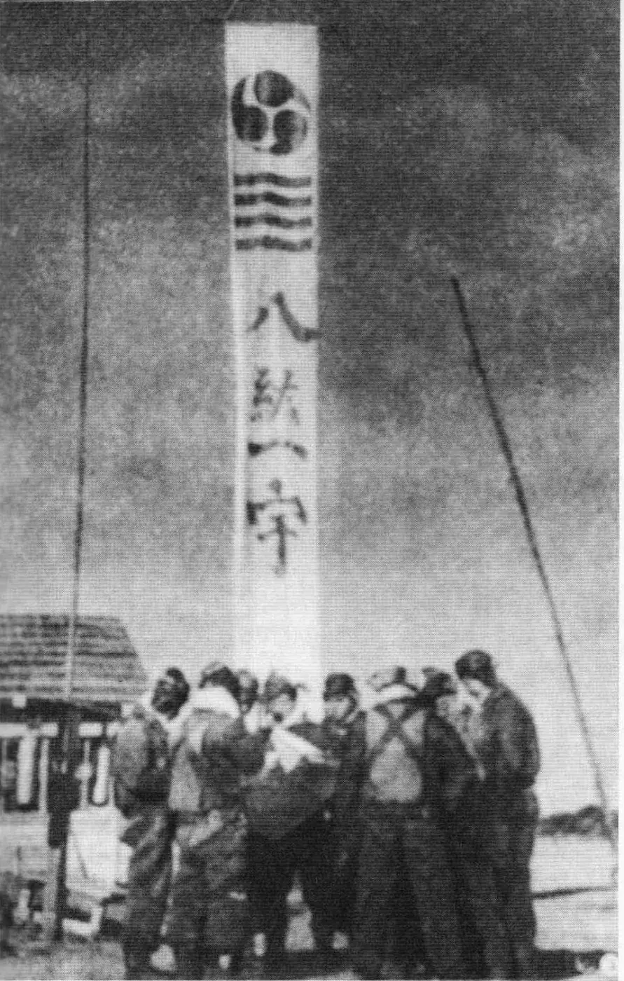"ฮักโก อิจิอุ" เป็นคำที่กองทัพญี่ปุ่นใช้ในการประกาศความชอบธรรมของสงครามมหาเอเชียบูรพา มีความหมายว่า "โลกเป็นหนึ่งเดียว" สำหรับกองทัพญี่ปุ่นแล้ว ความหมายคือ "การปกครองโลก" ซึ่งแสดงให้เห็นถึงความทะเยอทะยานในการรุกราน "ฮักโก" หมายถึง แปดทิศที่ไกลโพ้น คำนี้มีที่มาจากตำราจีนโบราณ "เลี่ยจื่อ ถาม-ตอบ" (...ทังถามอีกว่า 'สิ่งของมีขนาดเล็กใหญ่หรือไม่? มีสั้นยาวหรือไม่? มีเหมือนกันและแตกต่างกันหรือไม่?' เกอตอบว่า 'ทางตะวันออกของทะเลป๋อไห่หลายร้อยล้านลี้ มีหุบเหวใหญ่ ซึ่งเป็นหุบเหวก้นบึ้งที่ไม่มีที่สิ้นสุด ชื่อว่า กุยซี น้ำจากแปดทิศเก้าทุ่ง และกระแสน้ำจากแม่น้ำฮั่น ล้วนไหลลงสู่ที่นั่น แต่ไม่เพิ่มขึ้นหรือลดลงเลย'...)