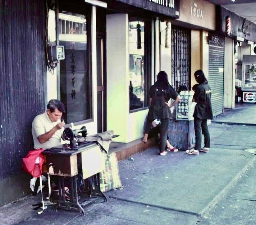 ภาพถ่ายจากปี พ.ศ. 2527 โดย Michael เผยให้เห็นวิถีชีวิตของช่างเย็บผ้าริมทาง ผู้ตั้งโต๊ะจักรเล็กๆ ใต้ต้นไม้ข้างถนน พร้อมอุปกรณ์เย็บผ้าครบมือ ลูกค้าหลายคนยืนรอด้วยความเชื่อใจในฝีมือของช่างคนนี้ บรรยากาศเรียบง่ายแต่เปี่ยมด้วยกลิ่นอายของความอดทนและขยันขันแข็ง