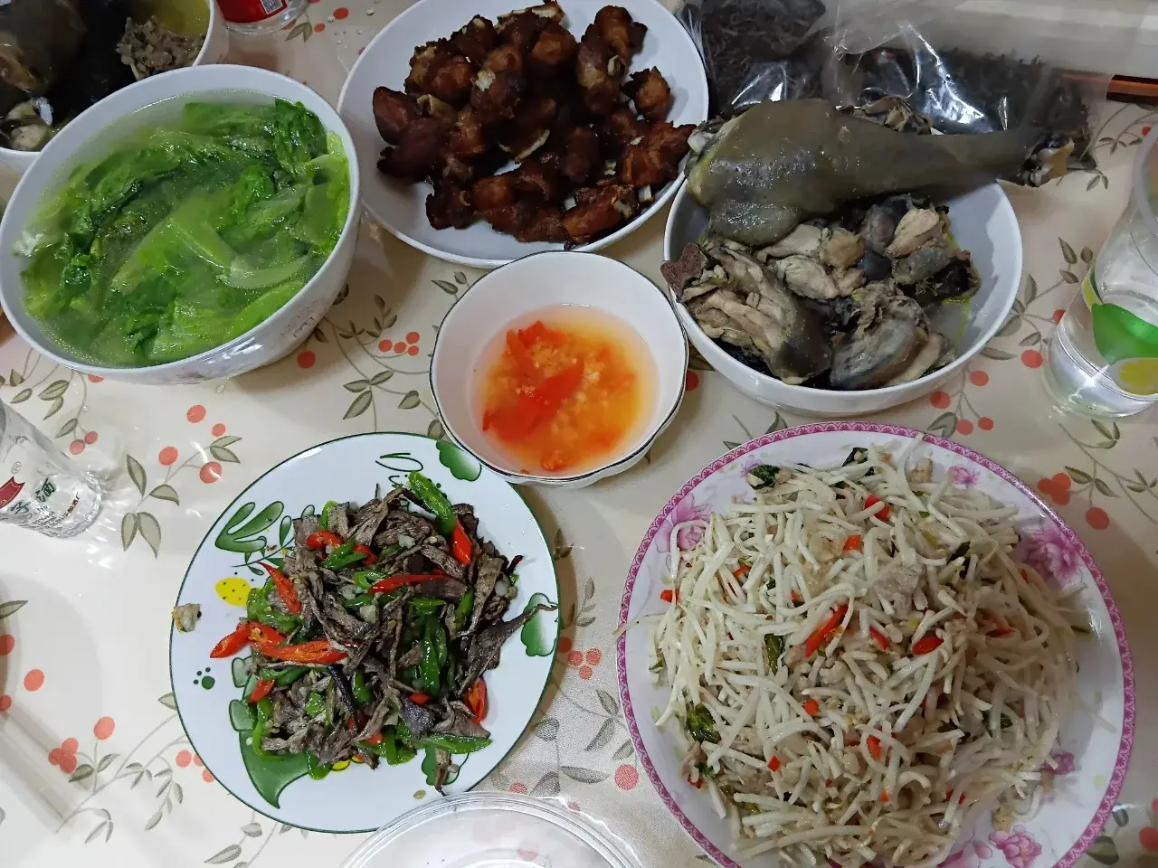 อาหารมื้อนี้เรานั้นทำเอง มีในส่วนของเห็ดสองชนิด ผัดในแบบง่าย มีน้ำจิ้มเท่านี้ก็อร่อยกันแล้ว ไม่ยากมาก อย่างอื่นคือผัก การมาที่สิบสองปันนาในครั้งนี้เราได้เที่ยวในหลากหลายสถานที่มาก วัฒนธรรมหลายอย่างนั้นทำให้เราเข้าใจว่าเราเองชอบการใช้ชีวิตในแบบราบเรียบ จากจานพูนนี้คือหมดภายในเวลาไม่นาน เพราะว่าความหิวหรือเพราะว่ายังไม่เคยกินในฝีมือของเรา