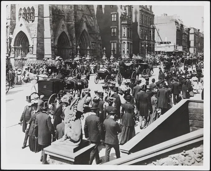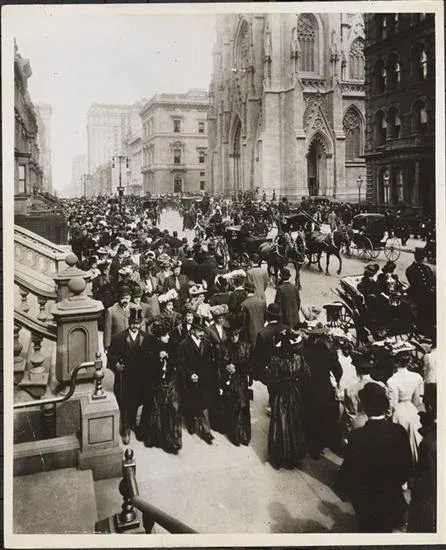 ต้นกำเนิดของขบวนพาเหรดอีสเตอร์สามารถย้อนกลับไปถึงยุคหลังสงครามกลางเมือง ซึ่งเป็นช่วงเวลาที่เรียกว่า "แฟชั่นพรอมานาด" หรือ "การเดินเล่นโชว์แฟชั่น" โดยได้รับแรงบันดาลใจจากการเดินเล่นในวันอาทิตย์ตามพิธีกรรมทางศาสนา ชาวนิวยอร์กผู้มั่งคั่งจะออกจากโบสถ์ตาม Fifth Avenue แล้วเดินเล่นไปตามถนน บางคนไปรับประทานอาหารในร้านอาหารใกล้เคียง หรือเยี่ยมเยียนทางสังคม โบสถ์เซนต์โทมัส ซึ่งตั้งอยู่บน Fifth Avenue และ 53rd Street ก็มีส่วนร่วมในประเพณีนี้ด้วย โดยส่งดอกไม้ไปยังโรงพยาบาลเซนต์ลุคที่ 54th Street แสดงให้เห็นถึงการผสมผสานระหว่างพิธีกรรมทางศาสนาและกิจกรรมทางสังคม