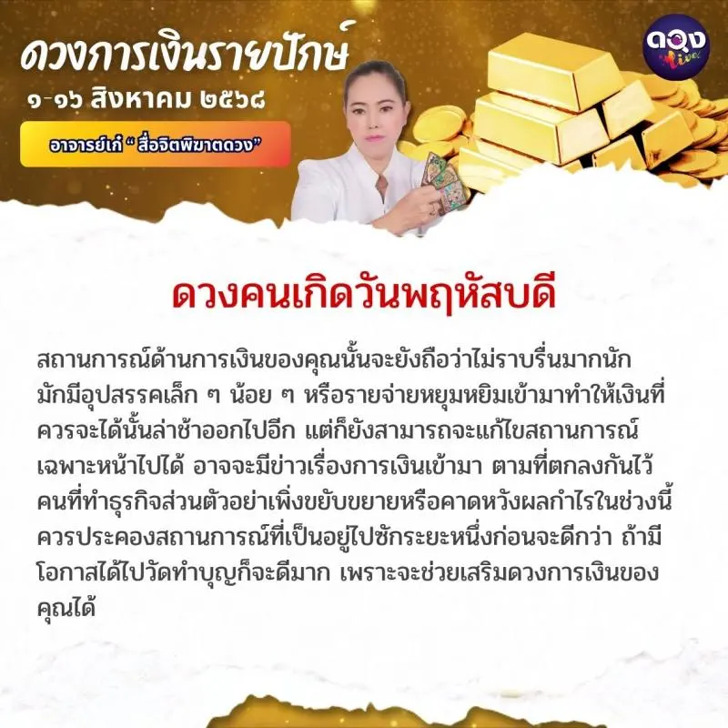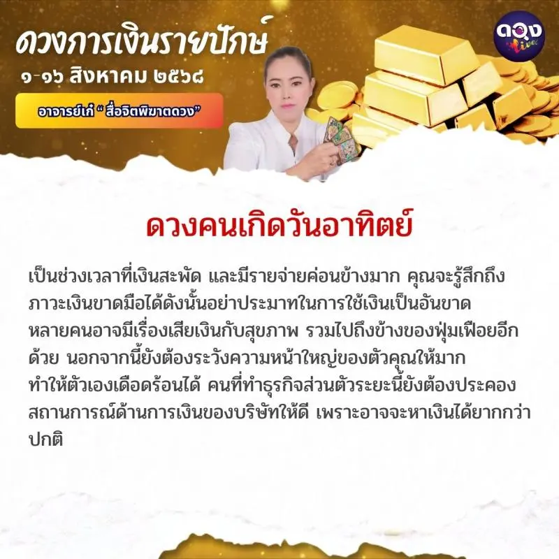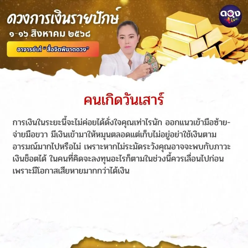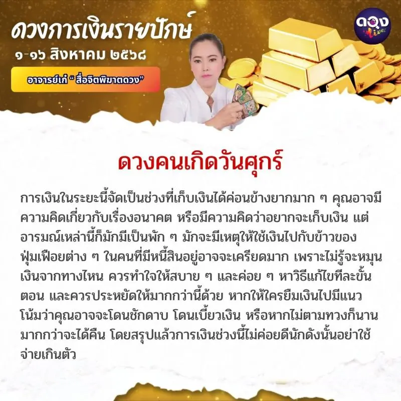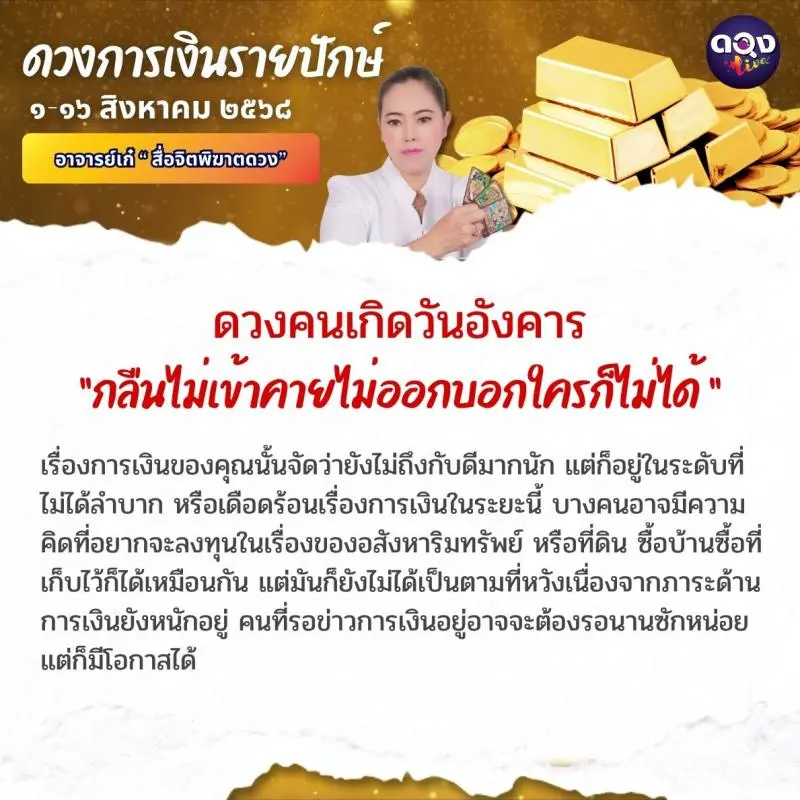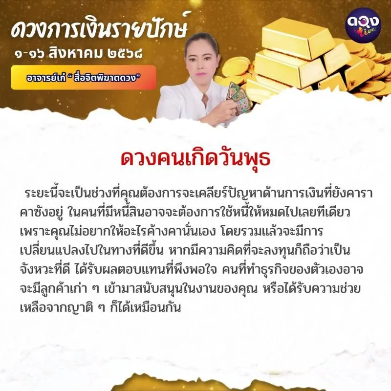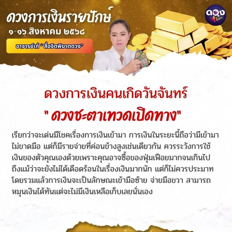 ดวงการเงินรายปักษ์ ประจำเดือนสิงหาคม ๖๘ ตั้งแต่วันที่ ๑-๑๖ ส.ค. ๖๘ ทำนายโดย อาจารย์เก๋ “สื่อจิตพิฆาตดวง”