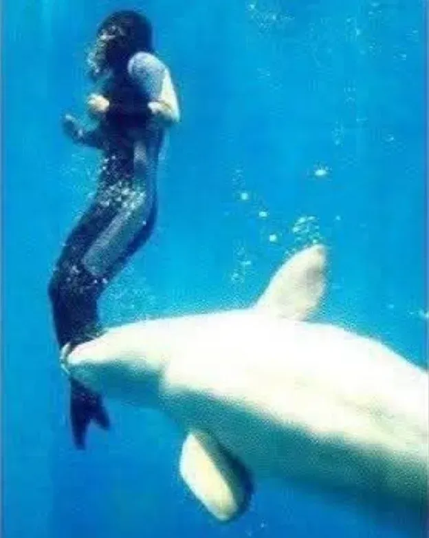 ไม่ใช่มนุษย์ครับ แต่เป็นวาฬเบลูกาตัวใหญ่ใจดีชื่อ “มีลา” (Mila) ที่ว่ายน้ำอยู่ในสระเดียวกัน