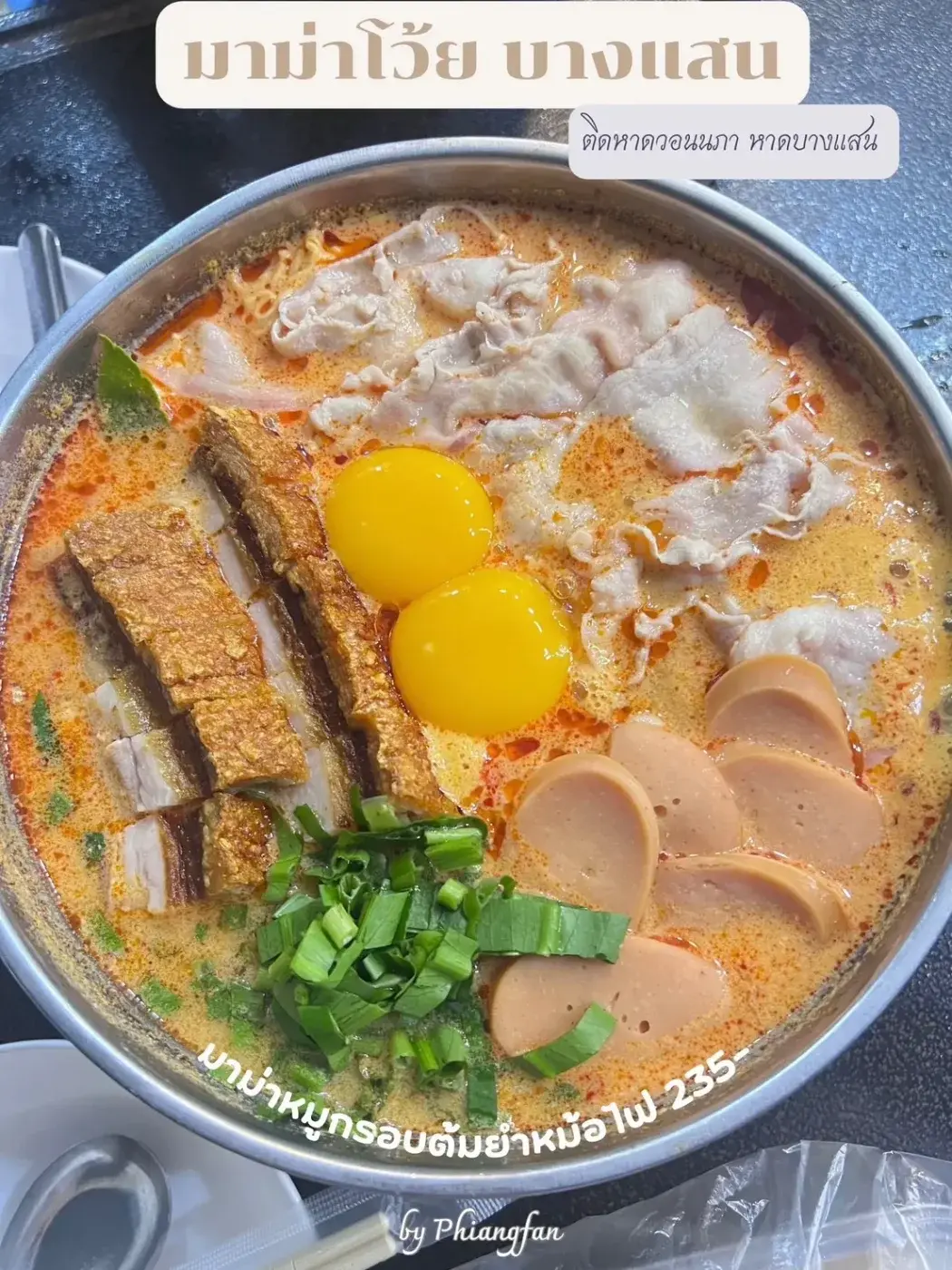 เมนูที่สั่งมานั้นเป็น มาม่าหมูกรอบต้มยำหม้อไฟ 235 บาท สั่งแบบทาน 2 คนค่ะ ซึ่งจะเห็นว่ามีเครื่องให้แบบแน่นๆ จุกๆ เลยค่ะ ให้เยอะมาก