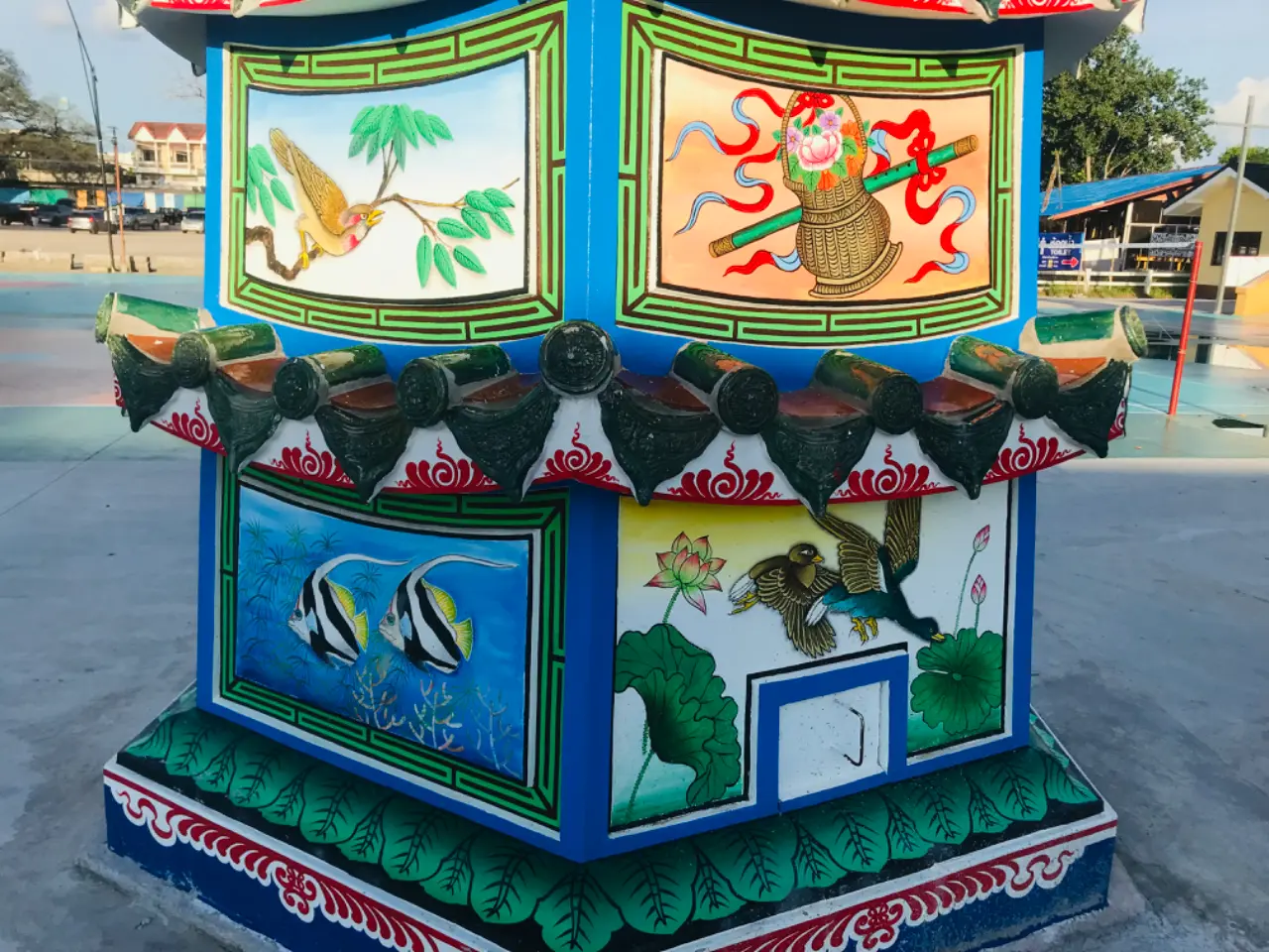 ศิลปะการลงสี การวาดลวดลายที่นี่ในทั้งหมดนั้นจะมีในเรื่องของความแตกต่างของแต่ละมุม มองตรงด้านหน้ามีเซียมซีสีแดง ไปด้านข้างนั้นจะมีส่วนของสิ่งเหล่านี้มากกว่า