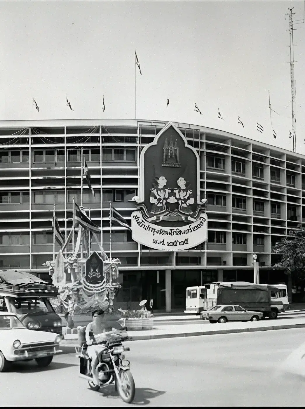 ภาพถ่ายกรมประชาสัมพันธ์ (อาคารเดิม) เมื่อปี พ.ศ. 2525 หรือราว 43 ปีก่อน บันทึกบรรยากาศในช่วงปีสำคัญของชาติ เมื่อกรุงรัตนโกสินทร์ครบรอบ 200 ปี ซึ่งในเวลานั้นพื้นที่แห่งนี้ถูกประดับประดาอย่างสวยงามด้วยแสงไฟ และติดตั้งโลโก้สัญลักษณ์ของงานสมโภชอย่างโดดเด่น สะท้อนความคึกคักและความภาคภูมิใจของคนไทยทั้งประเทศ