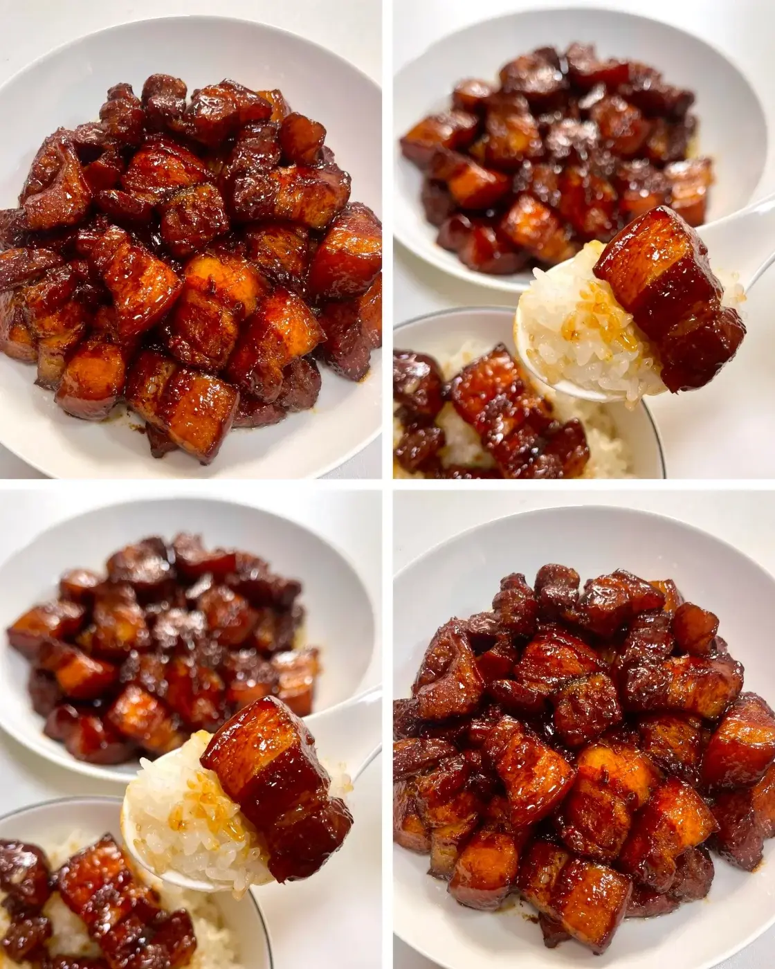 พอเสร็จ เราตักหมูสามชั้นเคี่ยวซีอิ๊วลงจาน ราดด้วยซอสที่เหลือในหม้อ เสิร์ฟพร้อมข้าวสวยร้อนๆ เม็ดข้าวนุ่มที่ค่อยๆ ซับซอสหวานเค็มเข้มข้น รับรองว่าใครได้ชิมจะต้องเผลอขอข้าวเพิ่มแบบไม่รู้ตัว