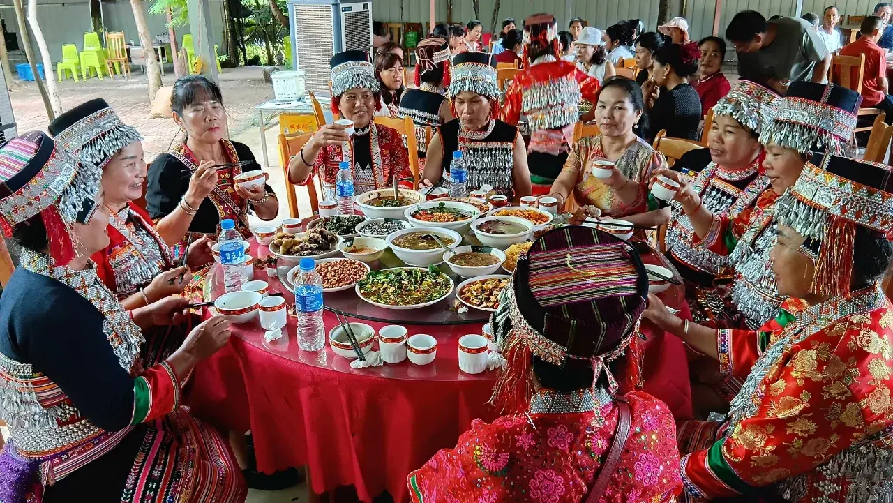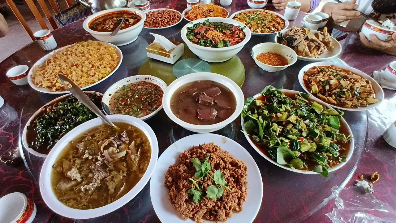 หลากหลายเมนูมากในการทาน มีเห็ด มีเนื้อ หน่อไม้ เลือด ไก่ หลายอย่างถูกจัดวางไว้มากมายพร้อมทาน อาหารนั้นยิ่งเยอะเท่าไหร่ยิ่งดี เพราะว่ามันหมายถึงความตั้งใจในการต้อนรับ แต่ในการทานอาหารนั้นเหมือนว่าจะมีว่า เวลาทานอาหารนั้นไม่ให้ทานจนหมดให้เหลือไว้ในจานนิดๆ เพื่อที่จะเป็นมารยาท และจะต้องชิมในทุกเมนูที่มี คนที่ทำนั้นจะพยายามแนะนำในเมนูต่างๆ สุดท้ายแล้วเขานั้นก็จะตักให้เพื่อให้เรานั้นได้ทาน