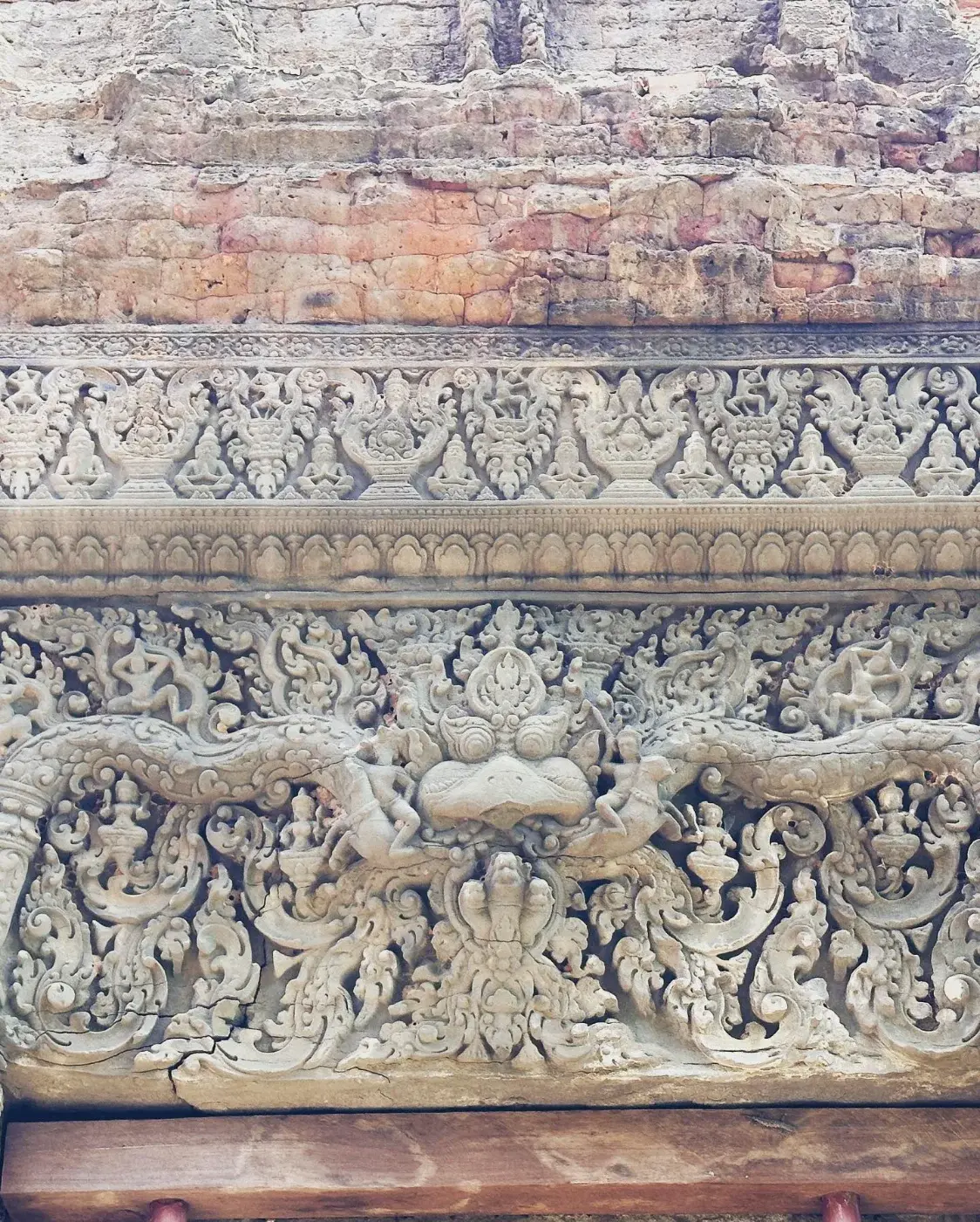 หากว่าเรานั้นมองดูโดยละเอียดเราจะเห็นความสวยงามของแผ่นหินขนาดใหญ่ที่ถูกนำมาแกะสลักอยู่ทางเข้าด้านบนประตู มีรูปร่างสวยงามมองแล้วมองอีก มีความสมบูรณ์มากที่สุด หากว่าใครไปในปราสาทในเสียมเรียบจะต้องได้มาถ่ายกับภาพแกะสลักนี้