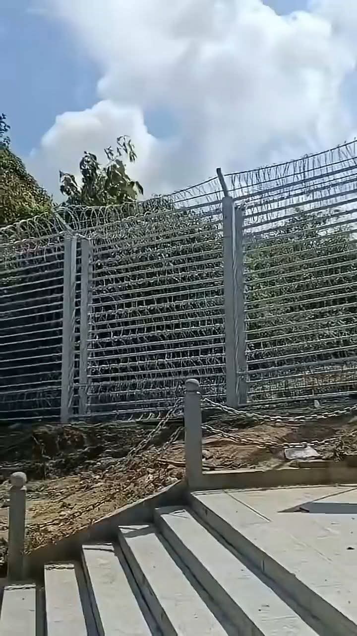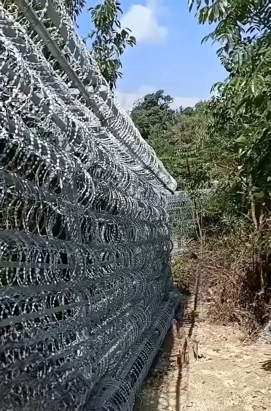 แนวรั้วเหล็กเสริมลวดหนามหีบเพลงที่ชายแดนเวียดนาม–กัมพูชา มีความสูงกว่า 2.30 เมตร ถูกออกแบบเพื่อเป็นกำแพงป้องกันที่ยากจะฝ่าได้ ด้วยการผสานโครงสร้างเหล็กแข็งแรงเข้ากับ ลวดหนามหีบเพลง (Concertina Wire / Razor Wire) ซึ่งมีใบมีดคมคล้ายใบมีดโกน เรียงเป็นวงซ้อนกันเหมือนลอนหีบเพลง สามารถยืดต่อความยาวได้ตามต้องการ