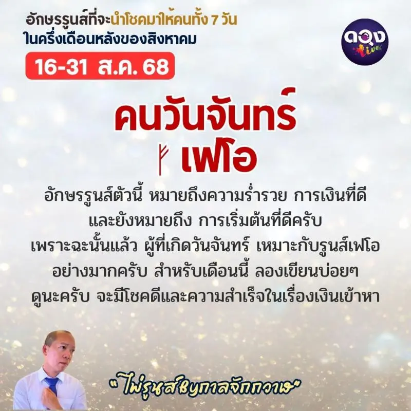ᚠ – เฟโอ อักษรรูนส์ตัวนี้หมายถึงความร่ำรวย การเงินที่ดี และยังหมายถึงการเริ่มต้นที่ดีครับ เพราะฉะนั้นแล้ว ผู้ที่เกิดวันจันทร์เหมาะกับรูนส์ "เฟโอ" อย่างมากครับ สำหรับเดือนนี้ ลองเขียนบ่อยๆ ดูนะครับ จะมีโชคดีและความสำเร็จในเรื่องเงินเข้าหา
