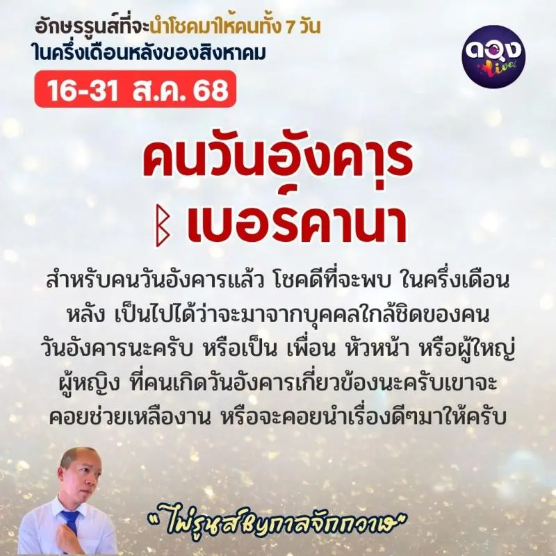ᛒ – เบอร์คาน่า สำหรับคนวันอังคารแล้ว โชคดีที่จะพบในครึ่งเดือนหลัง เป็นไปได้ว่าจะมาจากบุคคลใกล้ชิดของคนวันอังคารนะครับ หรือเป็นเพื่อน หัวหน้า หรือผู้ใหญ่ผู้หญิงที่เกี่ยวข้องกับคุณ เขาจะคอยช่วยเหลืองาน หรือจะคอยนำเรื่องดีๆ มาให้ครับ